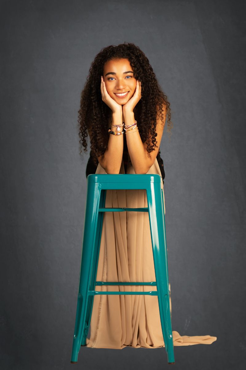 • Studio-Portrait einer jungen Frau mit lockigen Haaren, lächelnd hinter einem grünen Hocker vor dunklem Hintergrund