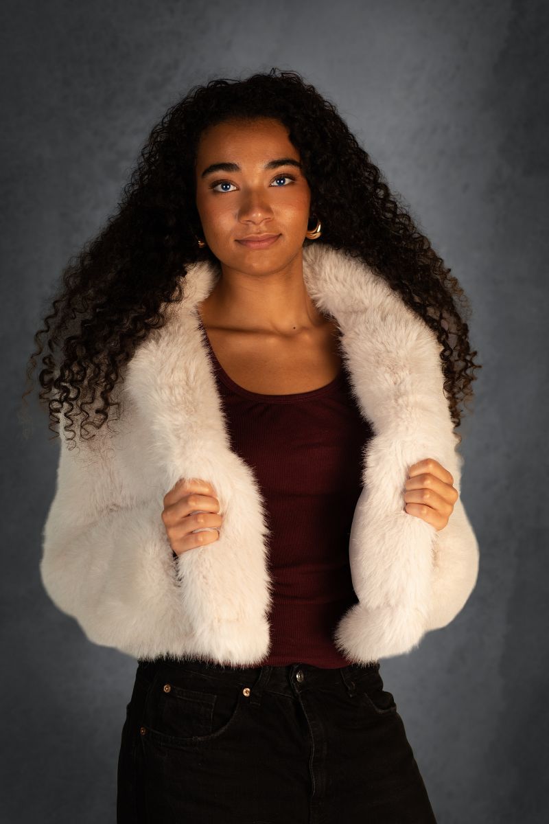 • Studio-Portrait einer jungen Frau mit lockigen Haaren und heller Jacke vor dunklem Hintergrund