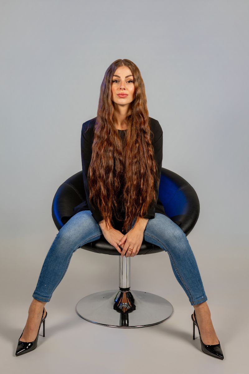 • Natürliches Studio-Portrait einer jungen Frau mit langen Haaren sitzend auf einem Stuhl vor hellem Hintergrund