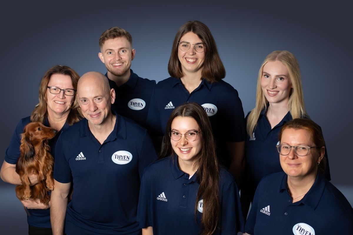 • Gruppenfoto eines Teams in einheitlichen dunkelblauen Poloshirts als Businessfoto für Corporate Branding