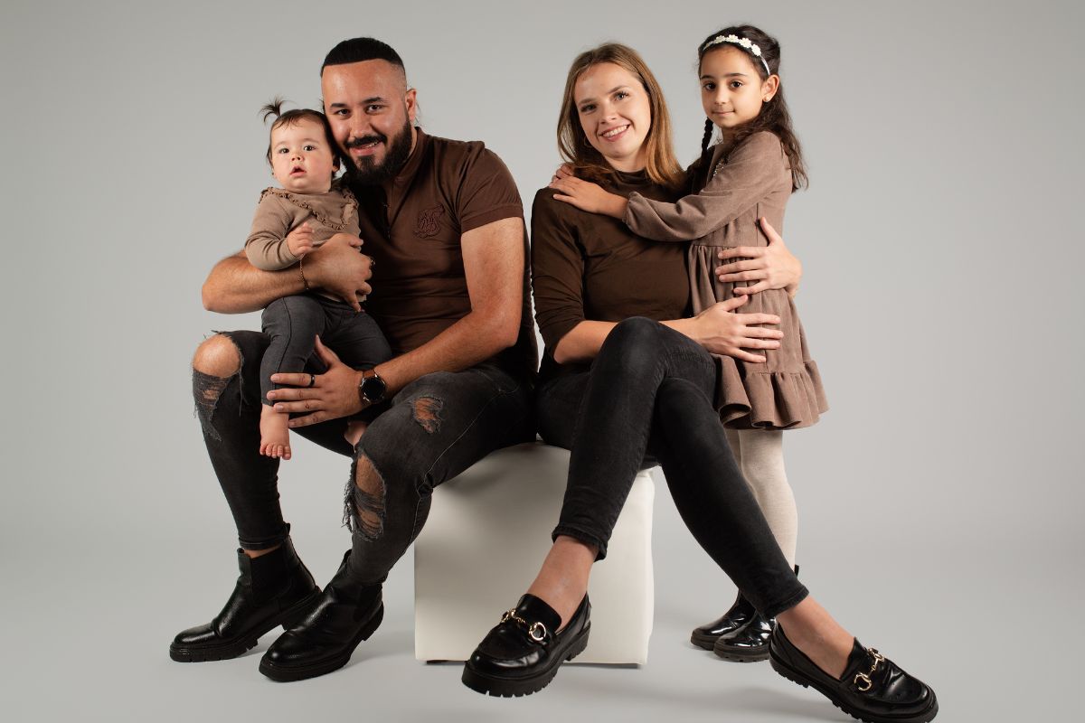 • Studio-Portrait einer Familie mit zwei Elternteilen, einem Baby und einem jungen Kind sitzend vor hellem Hintergrund
