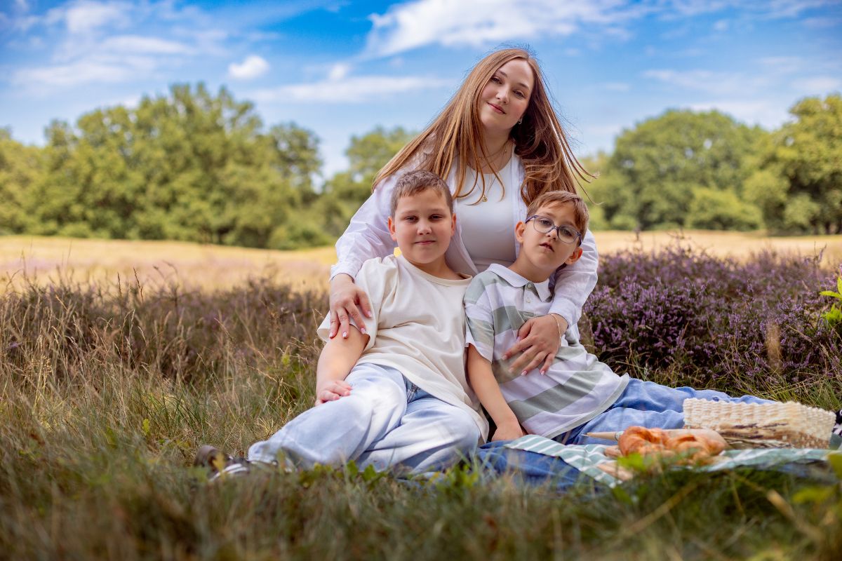 • Mutter mit zwei Kindern sitzend auf einer Picknickdecke in einer blühenden Wiesenlandschaft
