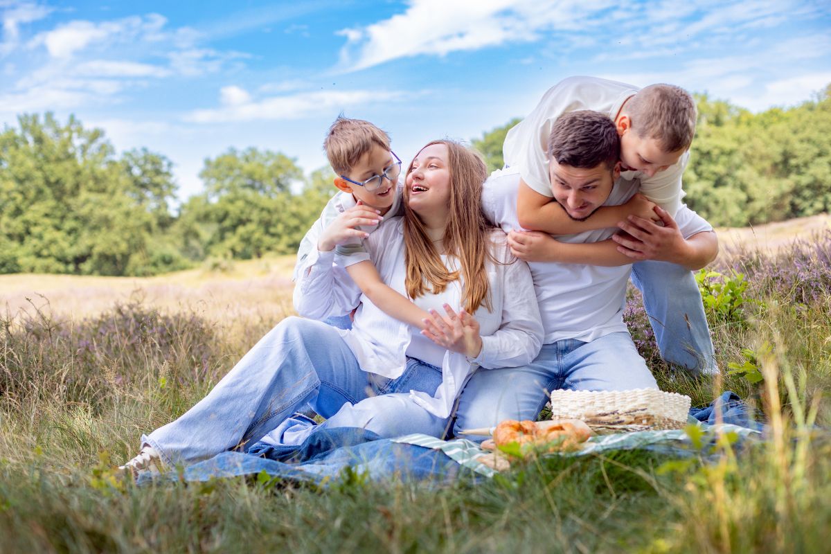 • Familie sitzt lachend auf einer Picknickdecke, Kinder spielen und umarmen die Eltern in einer Wiesenlandschaft