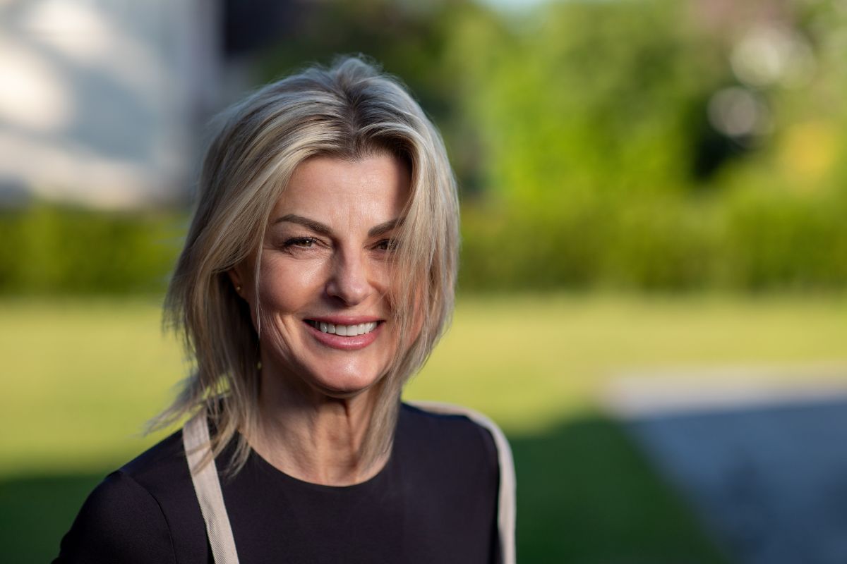 • Natürliches Outdoor-Portrait einer lächelnden Frau mit blondem Haar vor unscharfem grünem Hintergrund