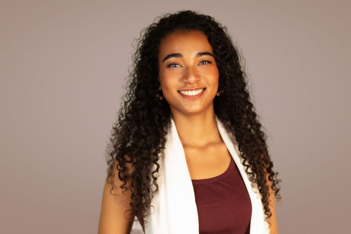 • Natürliches Portrait einer jungen Frau mit lockigen Haaren im Studio