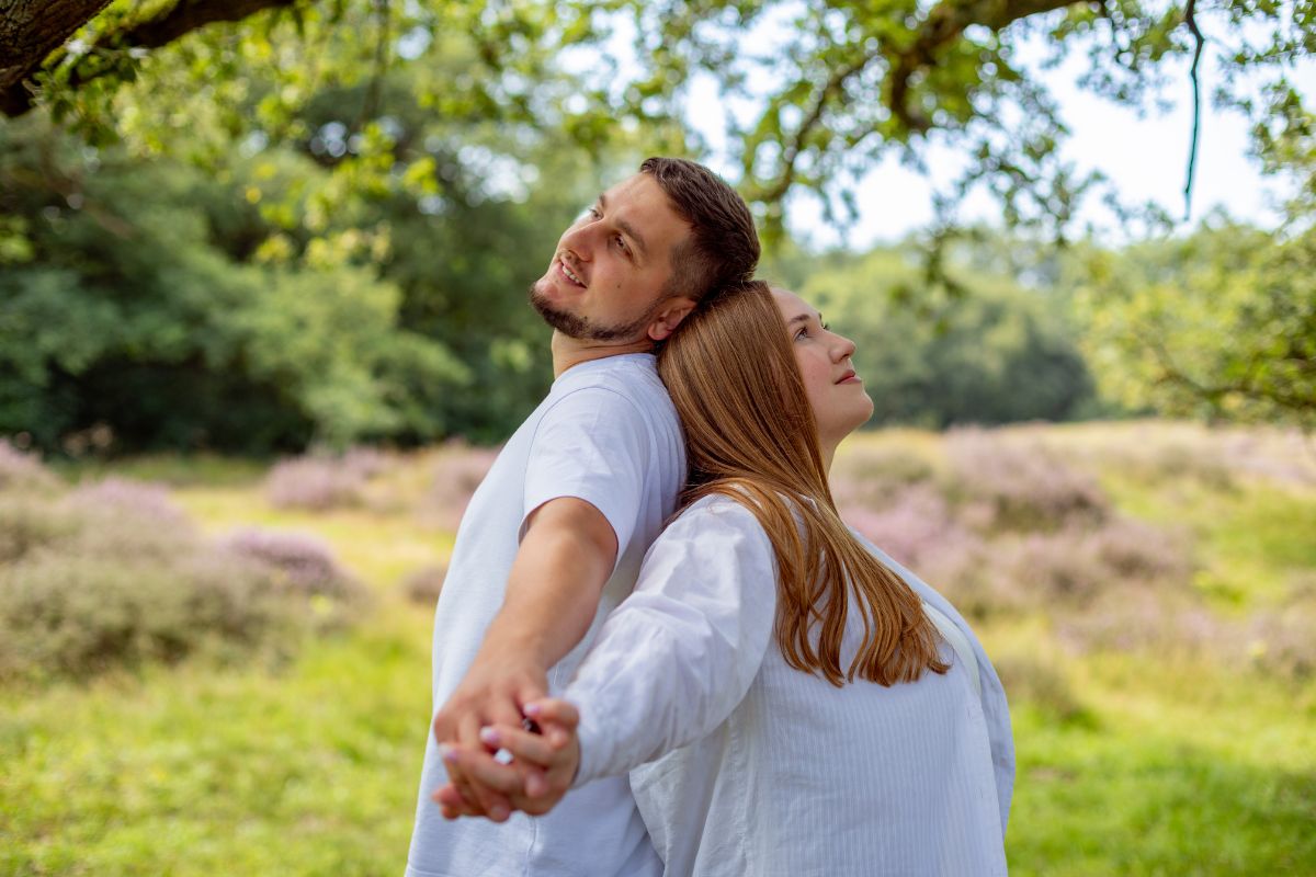 • Junges Paar steht Rücken an Rücken im Freien und hält sich an den Händen