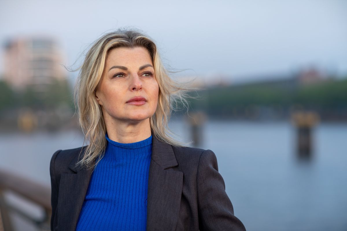 • Outdoor-Portrait einer Frau mit blondem Haar vor einem Gewässer und unscharfer Stadtkulisse im Oldenburger Hafen