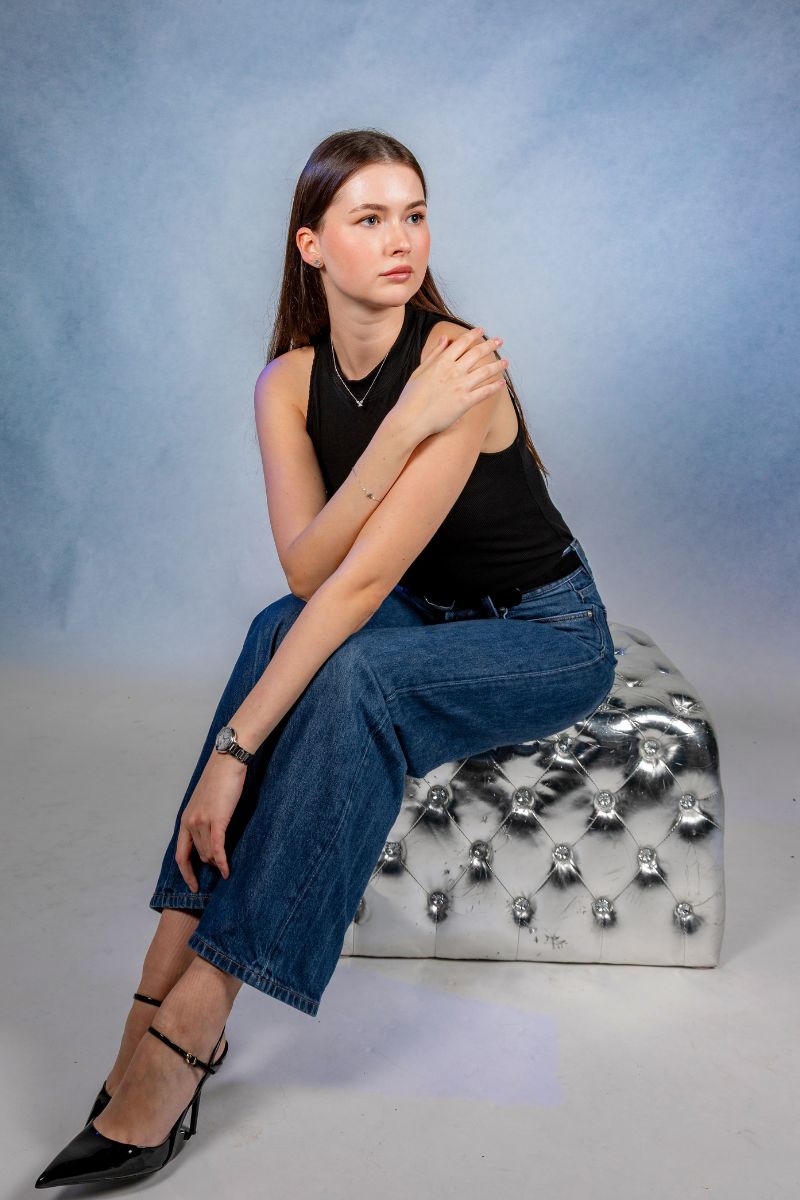 • Bild einer auf einem silberfarbenen Hocker sitzenden jungen Frau