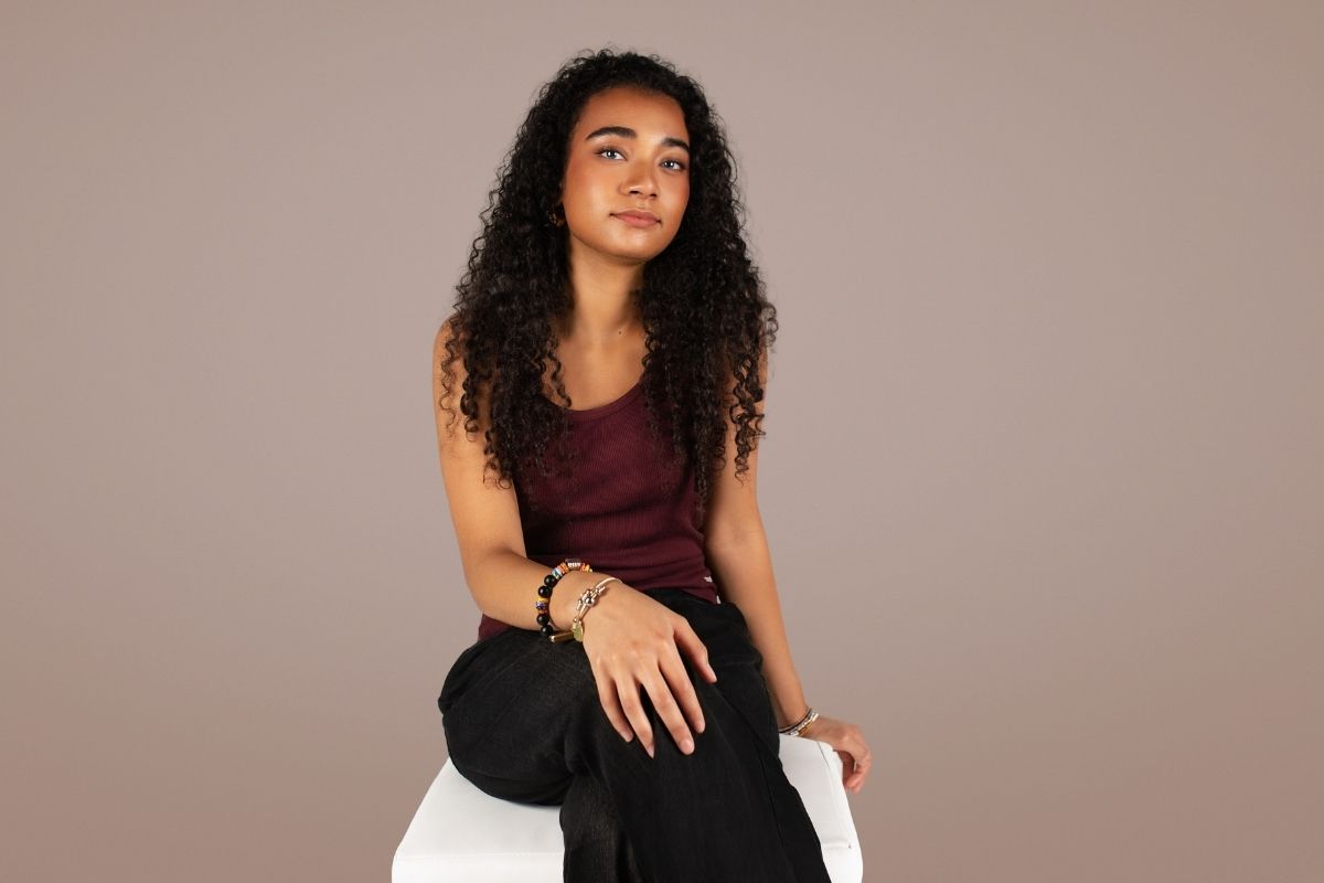 • Natürliches Studio-Portrait einer jungen Frau sitzend auf einem Hocker vor hellem, neutralem Hintergrund