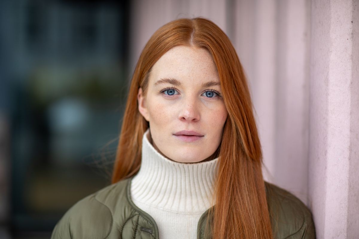 • Nahes Outdoor-Portrait einer jungen Frau mit roten Haaren vor unscharfem urbanem Hintergrund vor dem Oldenburger Theater