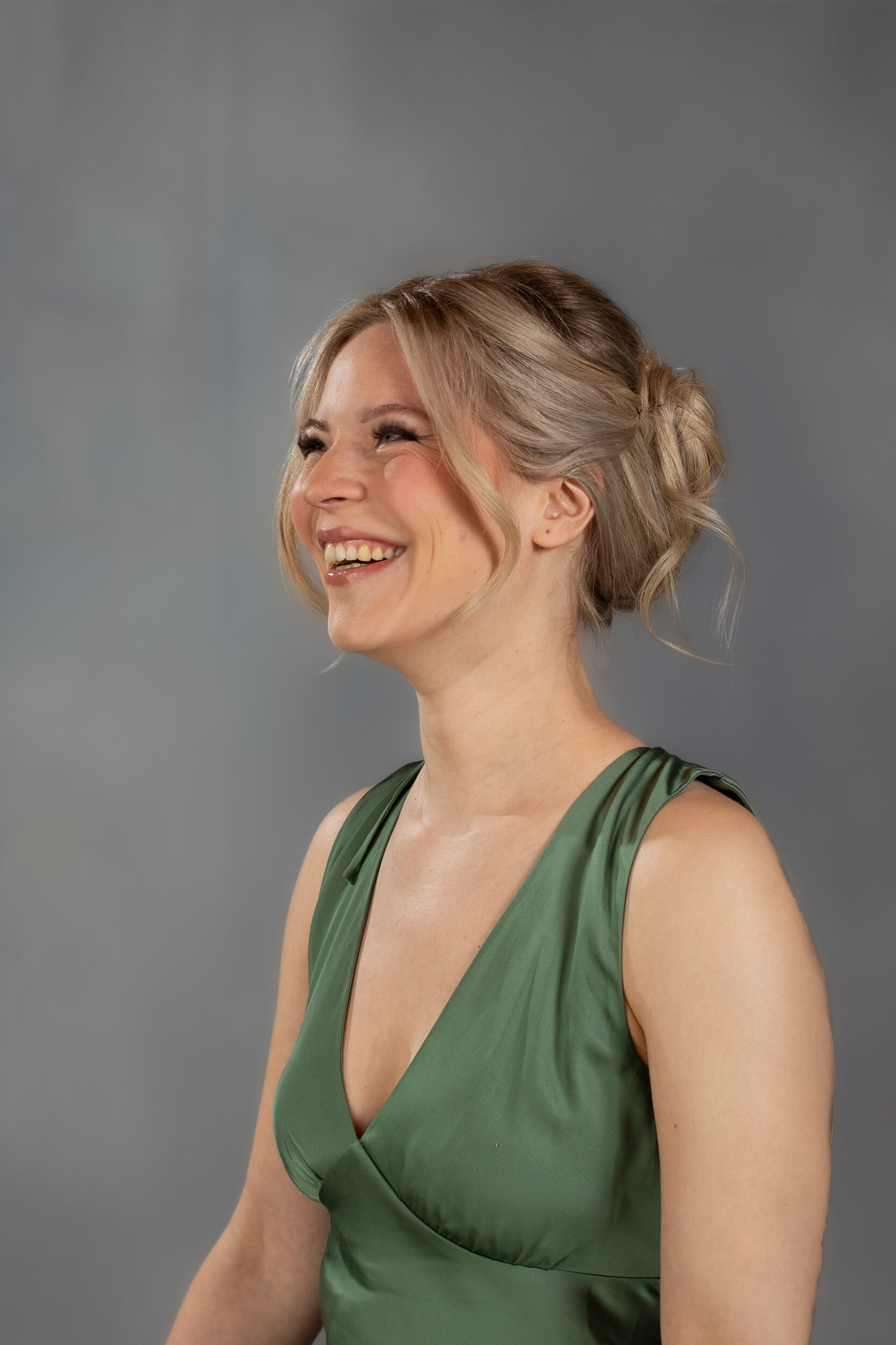 • Natürlich lachendes Portrait einer Frau im grünen Kleid in Seitenansicht – Portraitfotograf Oldenburg